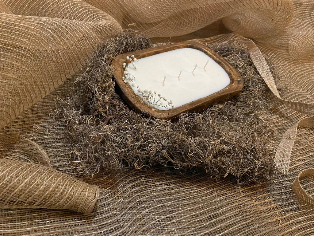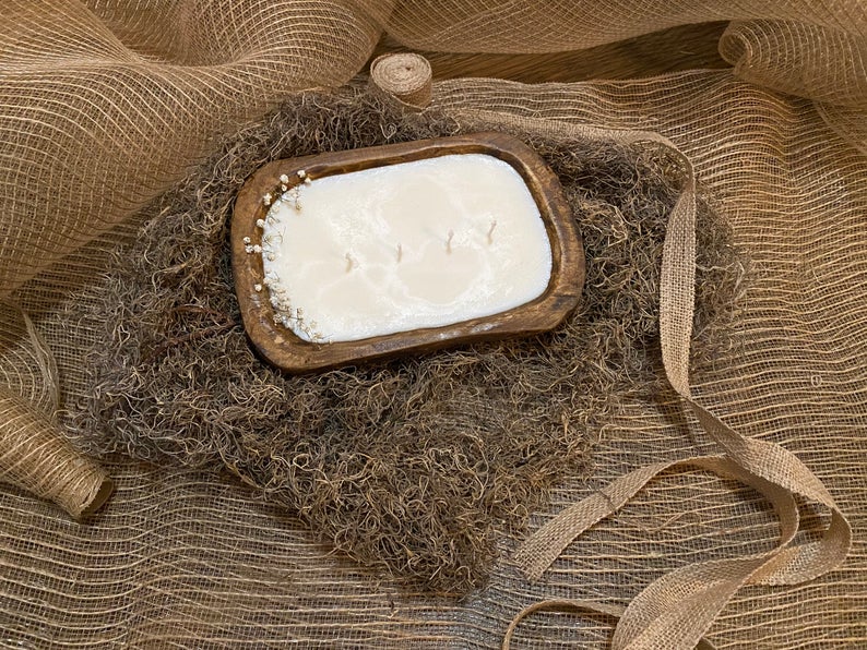 Our Rustic Holiday Collection exerts a simplistic and blemished charm. The dough bowl candles are made with Soy and Beeswax which adds a natural sweet scent to the essential oil fragrance.